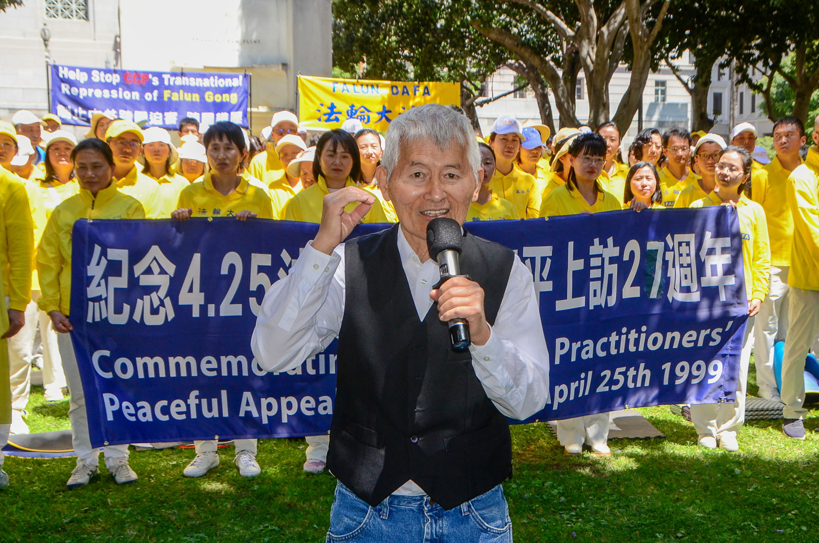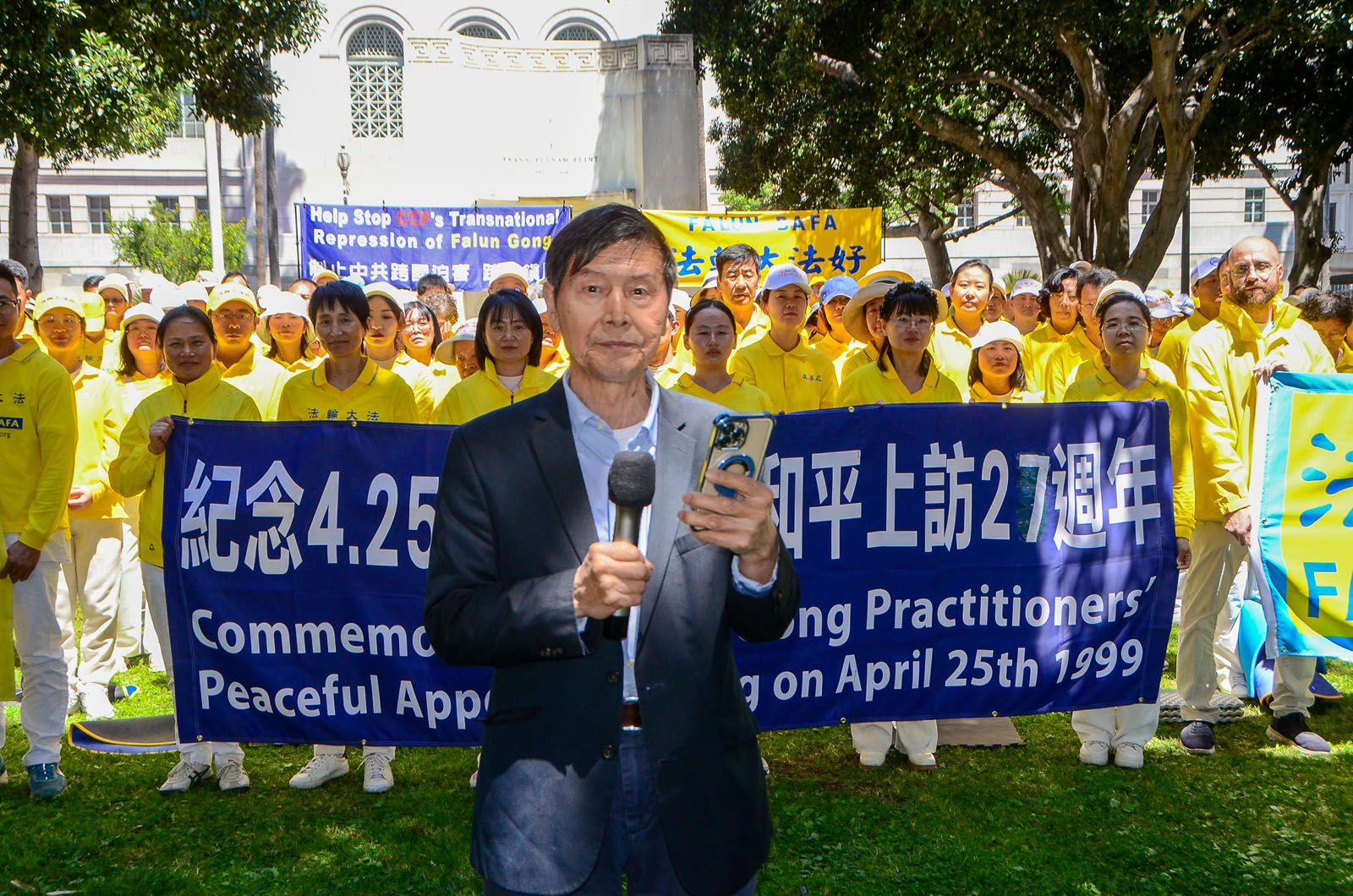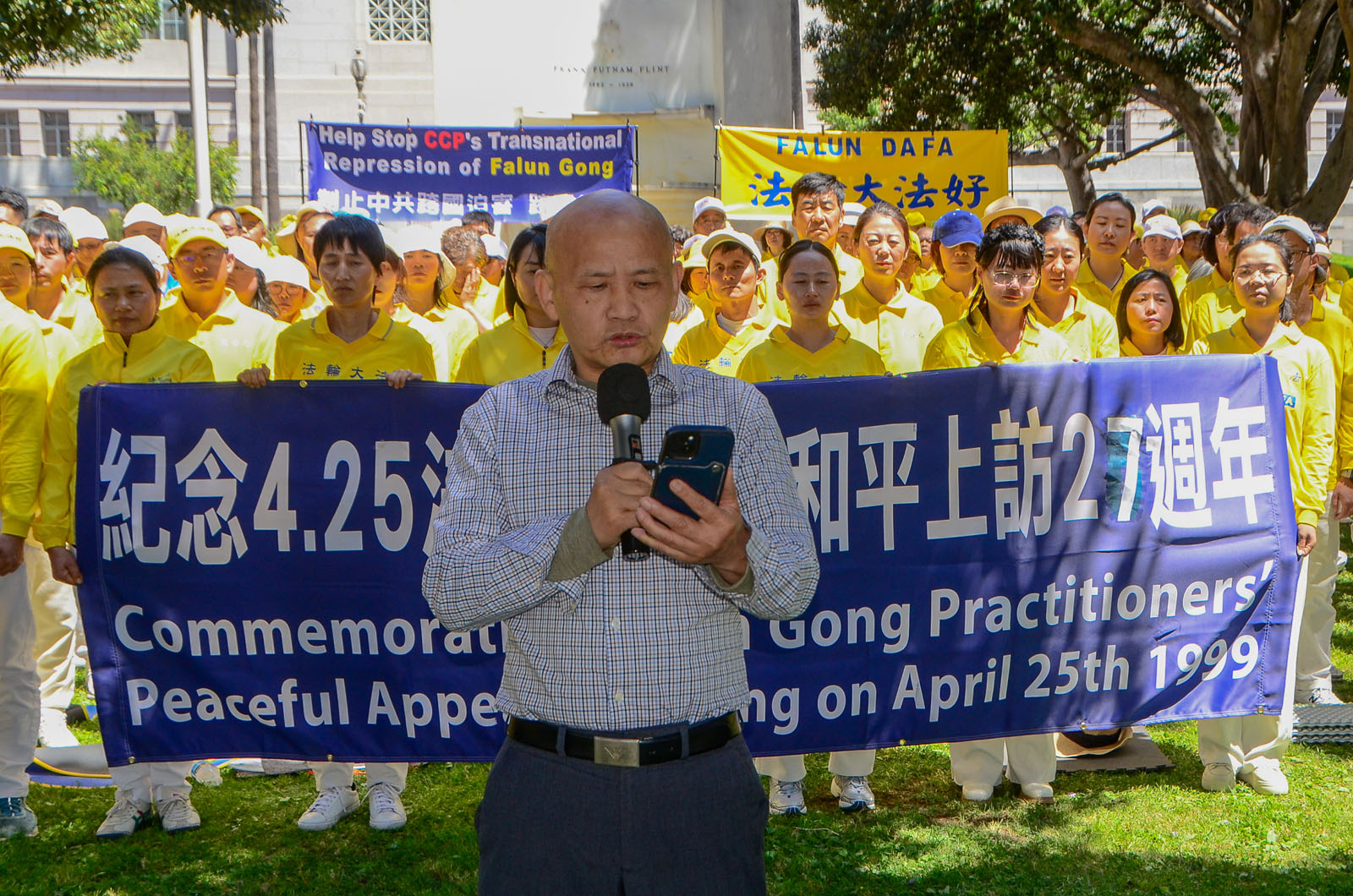 ![]() 图6:南加州资深时政评论人郭树人在洛杉矶法轮功纪念“四·二五”和平上访27周年集会上发言(大纪元) |