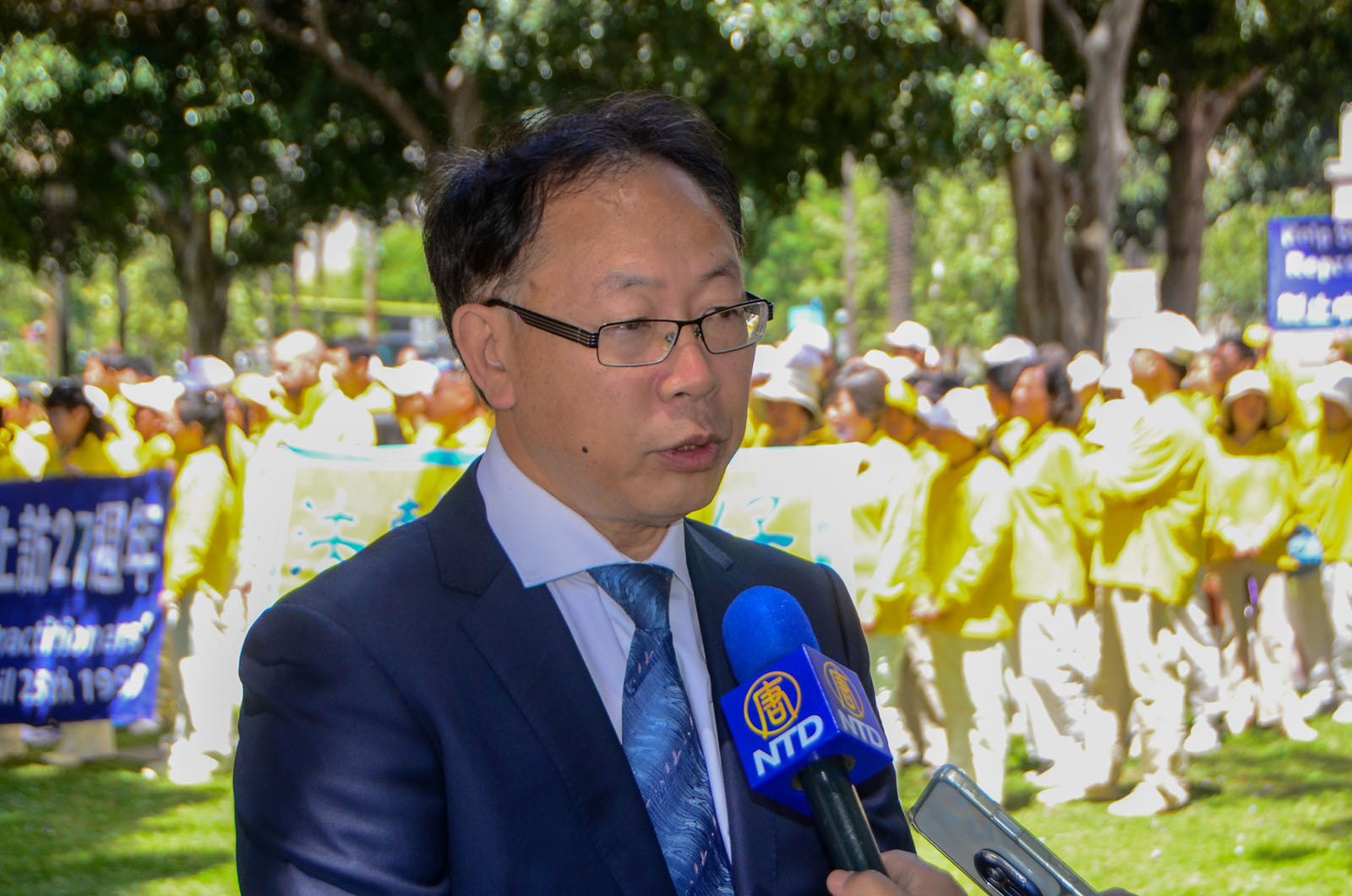 ![]() 图8:前中国人权律师游飞翥在洛杉矶法轮功纪念“四·二五”和平上访27周年集会上受访(大纪元) |