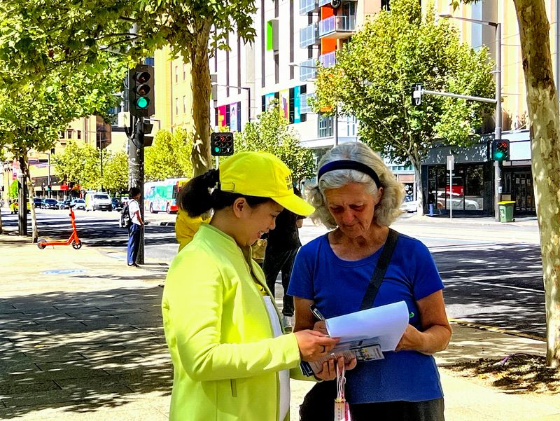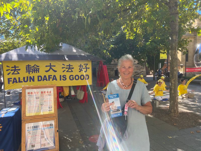 周末在市区进行骑行运动的市议员简·班格(Cr Jane Bange)很高兴地主动过来跟学员攀谈。“我一眼就认出你们来了,我去过台湾五次,我在故宫博物院等处看到过法轮功的大型活动,非常引人注目,非常好。我看到他们很多人在那里静静地打坐,我很高兴台湾政府没有干预,允许他们这样做,因为那是一个民主国家。我认为领导人维护民主和言论自由的原则至关重要,应该允许人们和平地做自己想做的事情,只要不伤害他人。并且不向外国政府屈服,让人们有实践自己的信仰、自由自在生活的保障。”