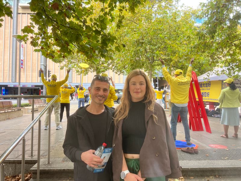 凯蒂·西伊(Kitie Ciui)和乔·穆萨雷拉(Joe Musarewla)被明亮、祥和的炼功场面吸引,看到真相横幅上法轮功学员被中共恶警暴打的画面很是震惊,他们关切询问,得知法轮功学员在这里纪念“四·二五”和平上访二十七周年,并呼吁制止中共的迫害。