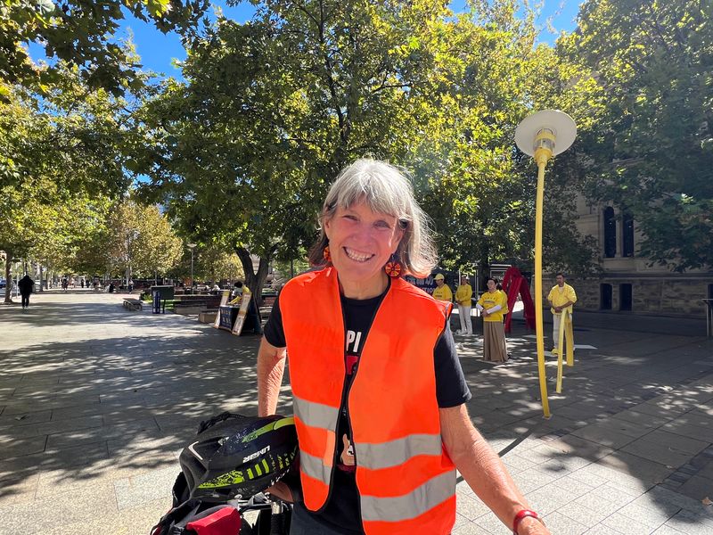 周末在市区进行骑行运动的南澳地方议会市议员、“大赦国际“组织的成员简·班格(Cr Jane Bange)巧遇法轮功学员纪念“四·二五”活动,她主动上前表达心声。