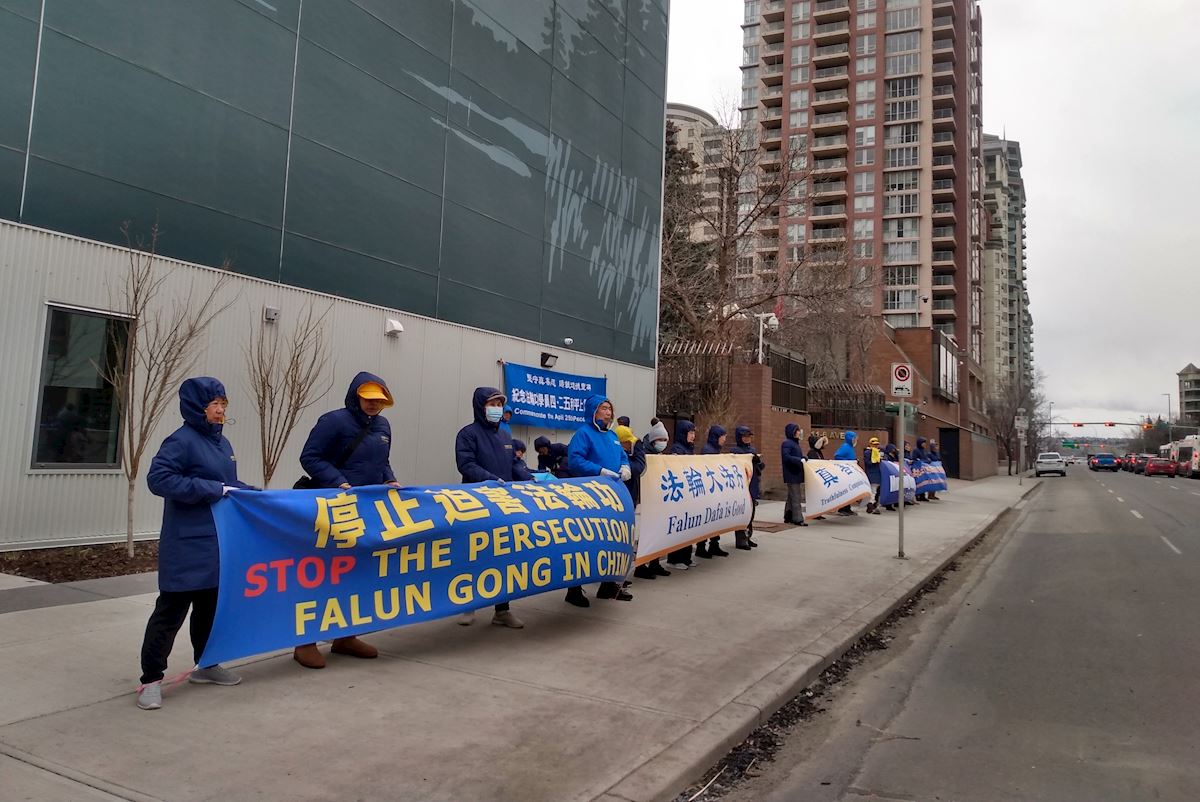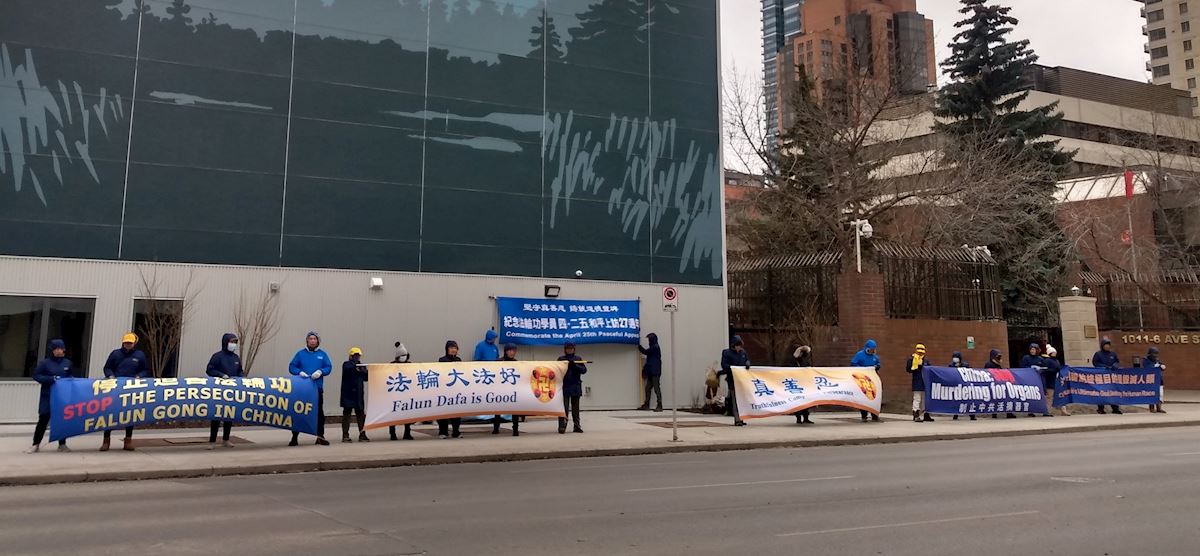 图1~3:四月二十四日下午,卡尔加里部分法轮功学员在中领馆前纪念“四·二五”和平上访27周年。