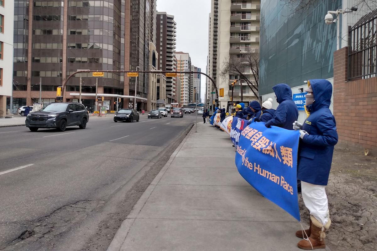 【明慧网二零二六年四月二十六日】(明慧加拿大记者站)连续鸣笛,竖大拇指,挥拳加油。二零二六年四月二十四日下班高峰时段,加拿大卡尔加里部分法轮功学员在中领馆前集会,纪念“四·二五”和平上访27周年,不时有经过的司机表达支持与声援。