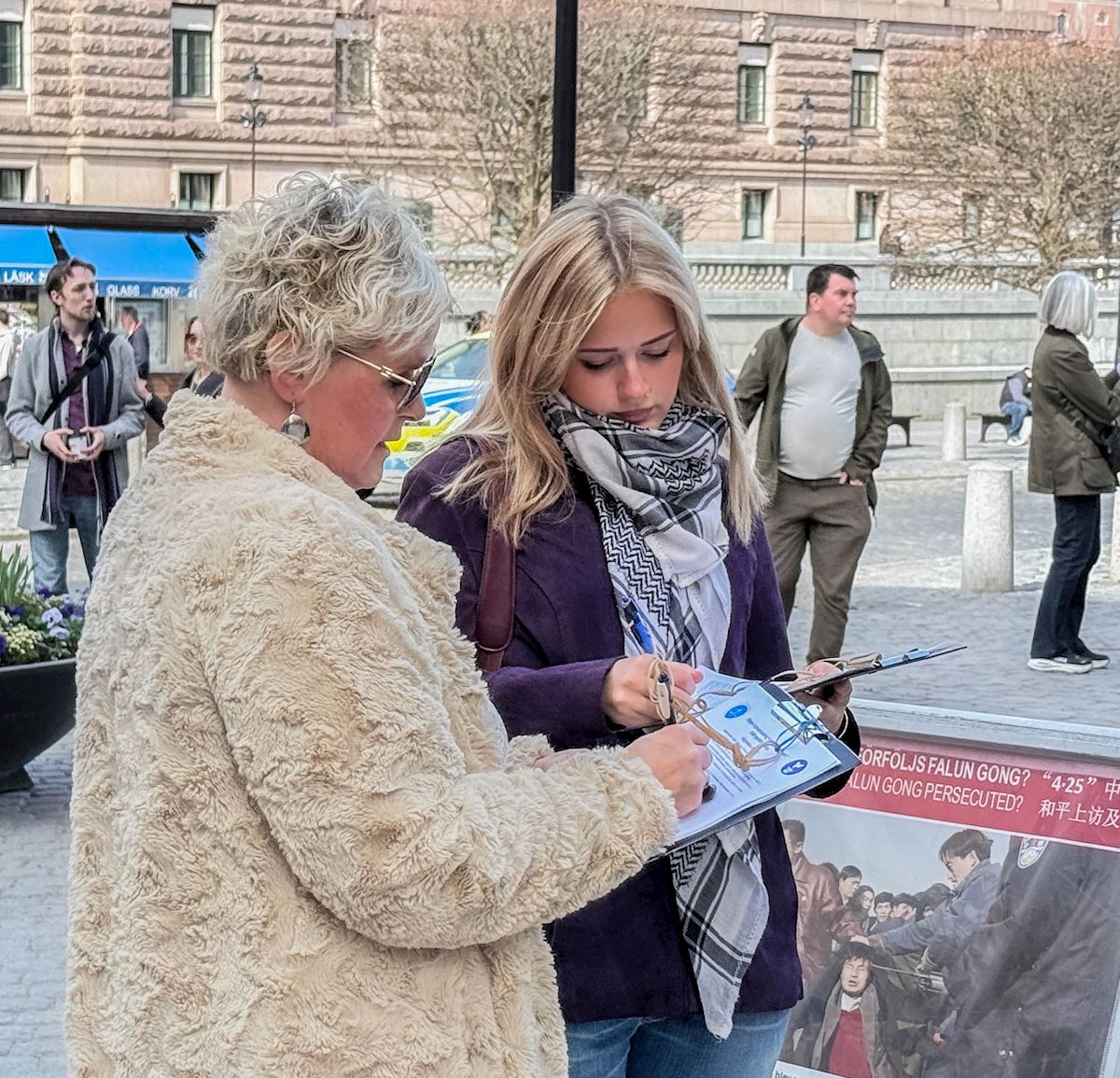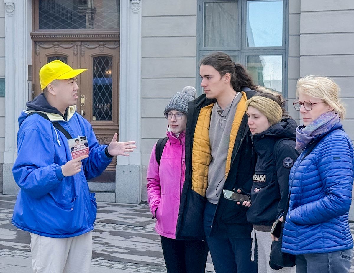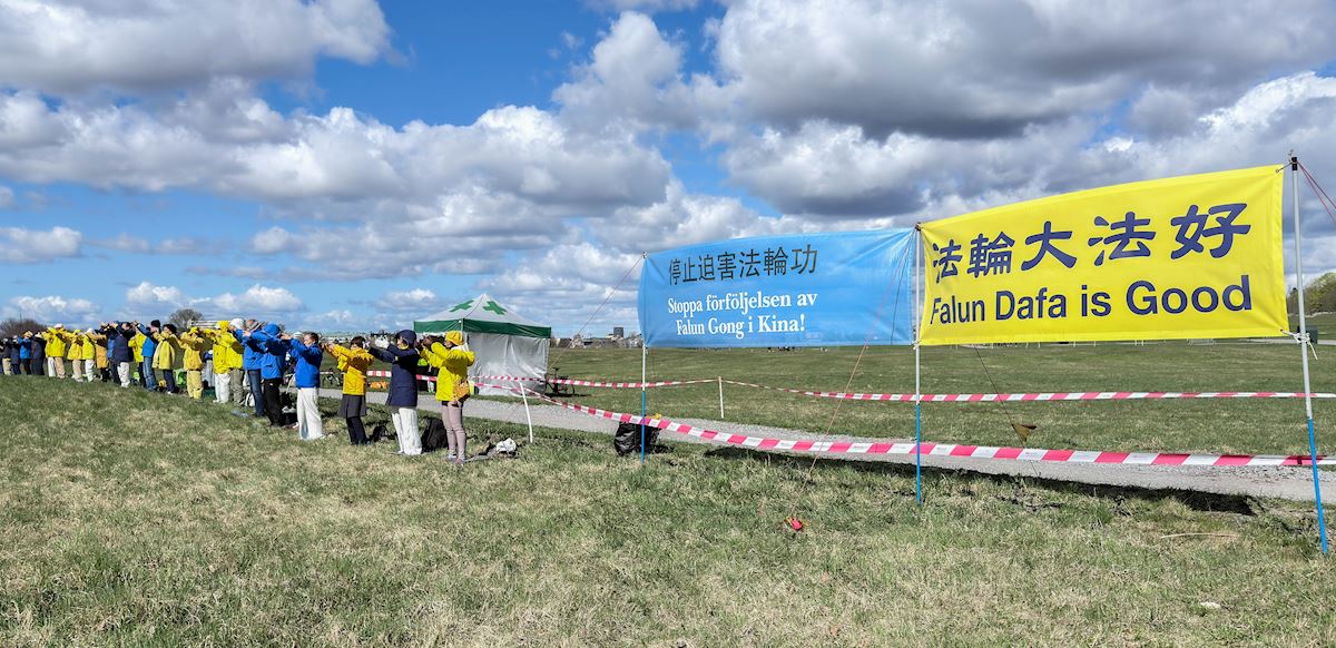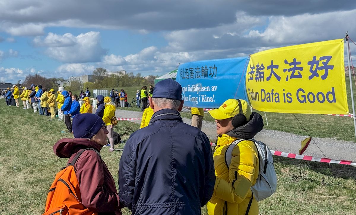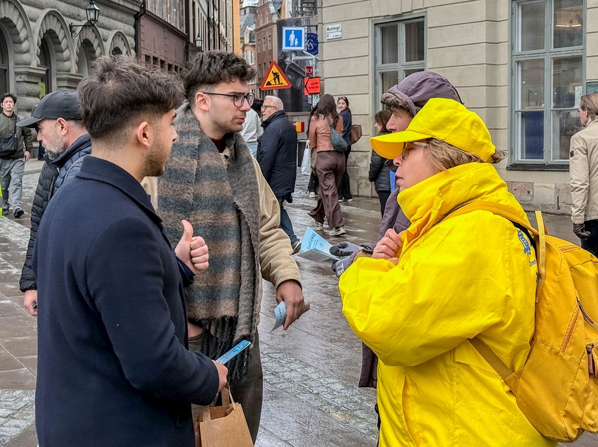 跟这位妇女交谈的正是瑞典的法轮功学员。27年来,他们每年都会在四月二十五日举办活动,为了纪念一九九九年他们的同修在中国举行的和平请愿。当年,逾万名法轮功学员为争取自由修炼的合法权利,前往北京国务院信访办和平上访,创下了在中共体制下大规模信仰团体和平请愿的先河。这个震惊世界的“四·二五”事件,却被中共江氏集团歪曲成 “围攻中南海”的罪名,悍然发动了迄今仍未停止的残酷迫害。