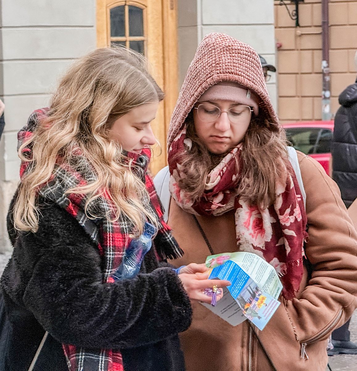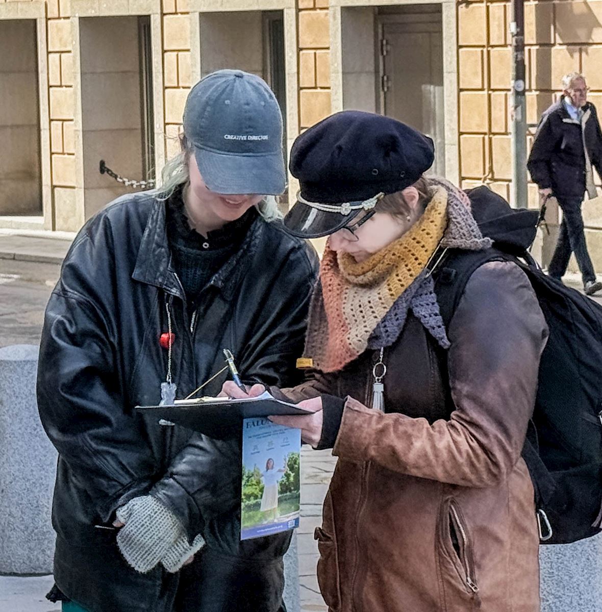 二零二六年四月二十五日,一位居住在使馆附近的中年妇女正沿着步道散步时,有人递给了她一张传单。仔细看过传单后,她停下脚步,与递传单的人进行了长时间的交谈。“我对你们举办的活动以及揭露迫害的材料很感兴趣。”她说。