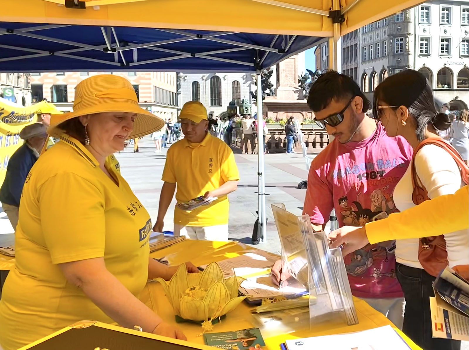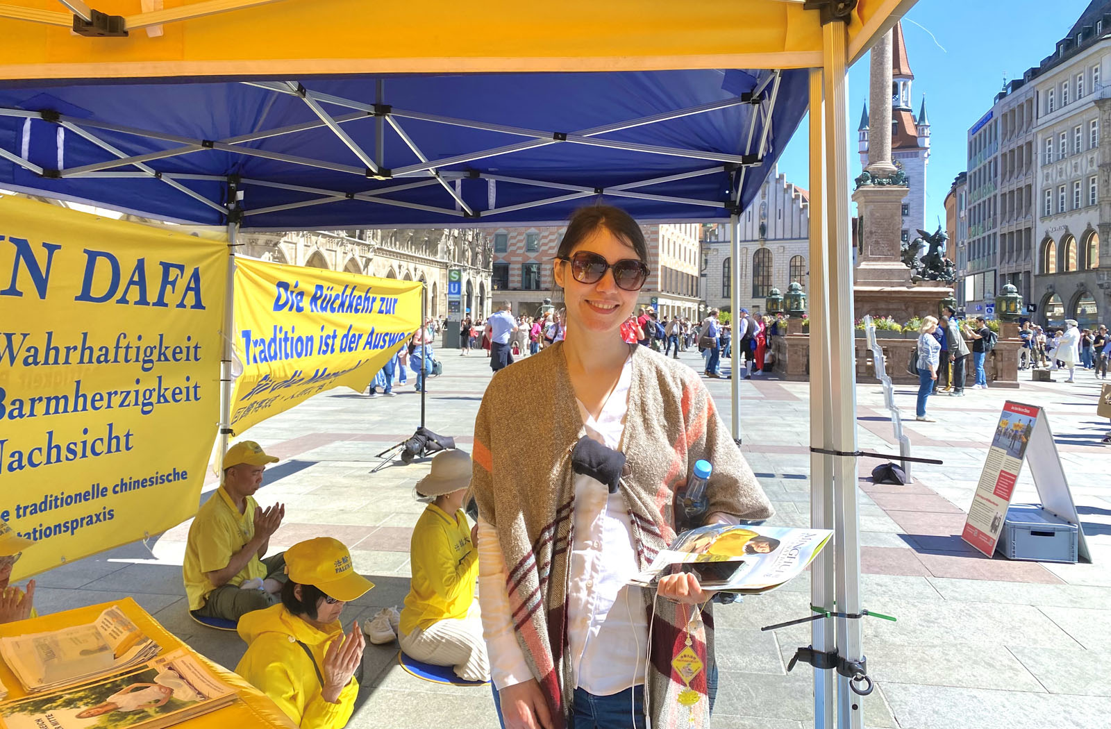 德国艺术家约翰娜(Johanna)的艺术作品透过绘画、色彩来表达,也运用她的声音来创作。当她看到法轮功学员在玛丽亚广场的活动后,停下脚步跟学员交谈了很长时间,之后,她签名声援法轮功学员反迫害。